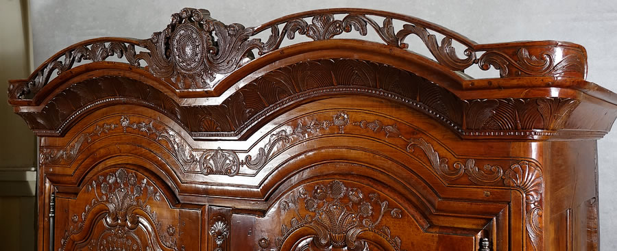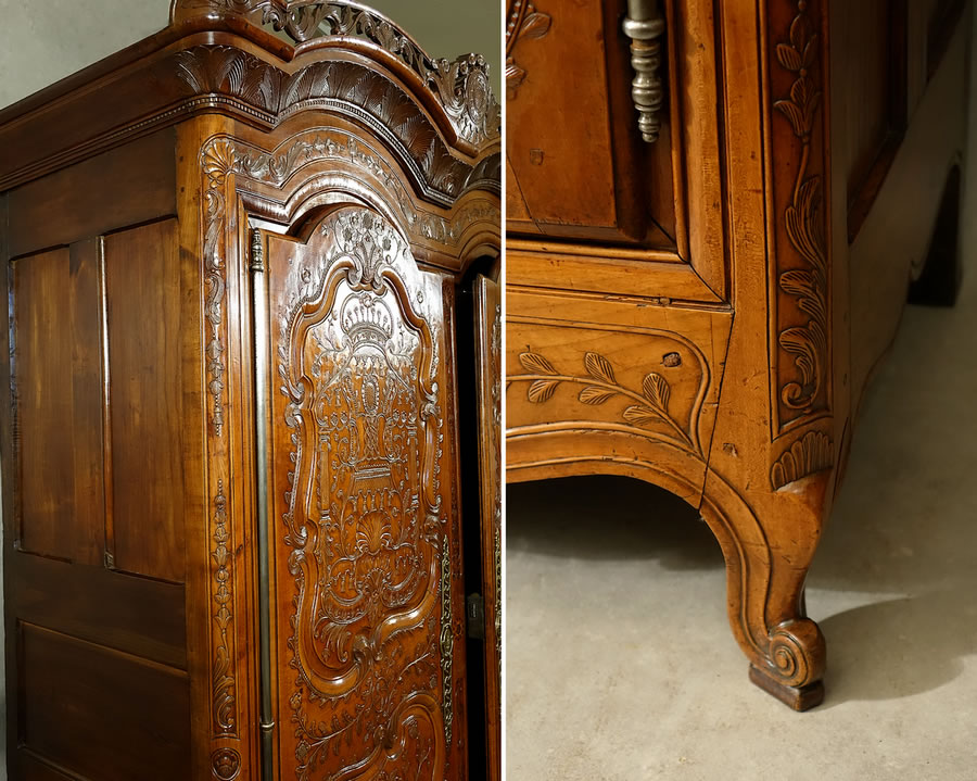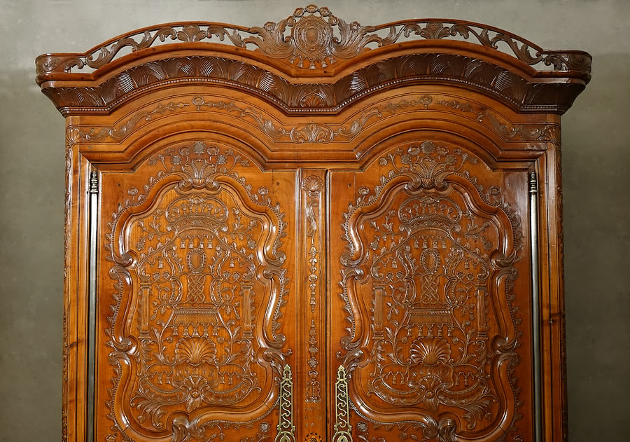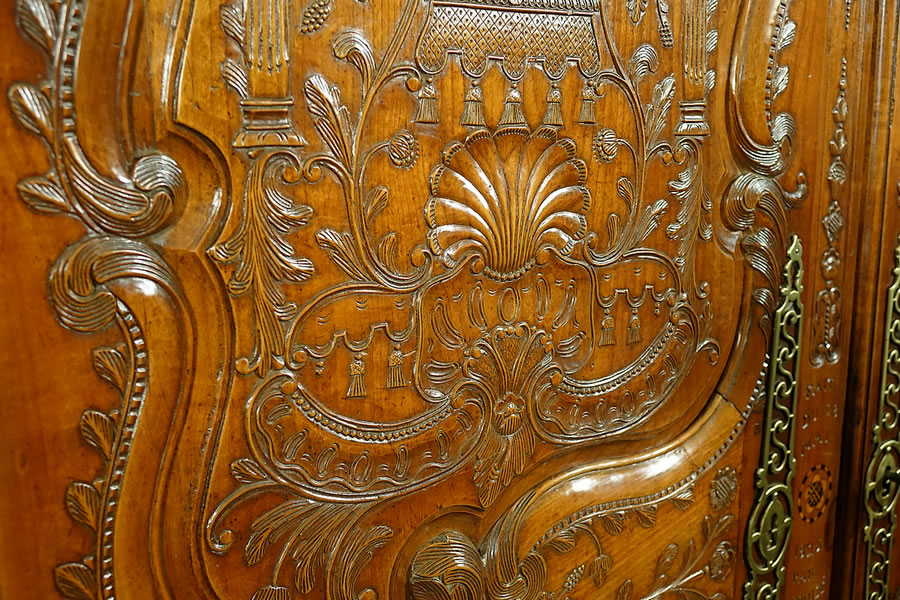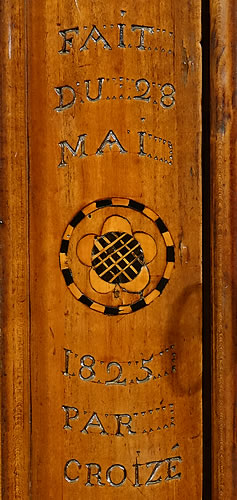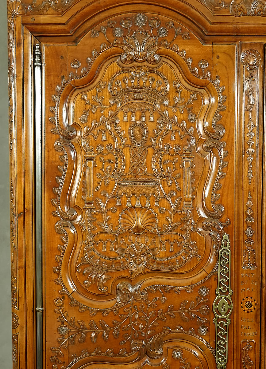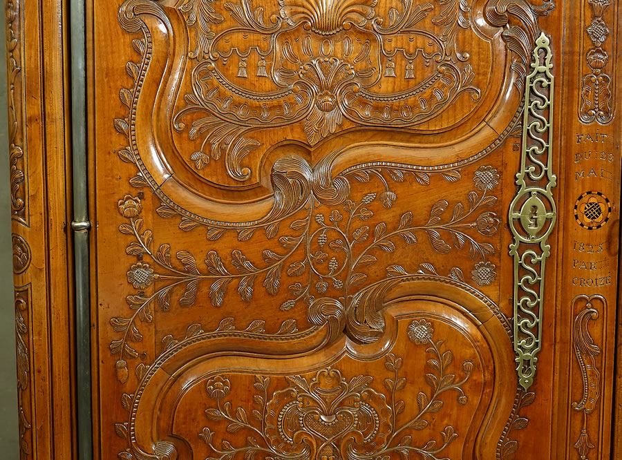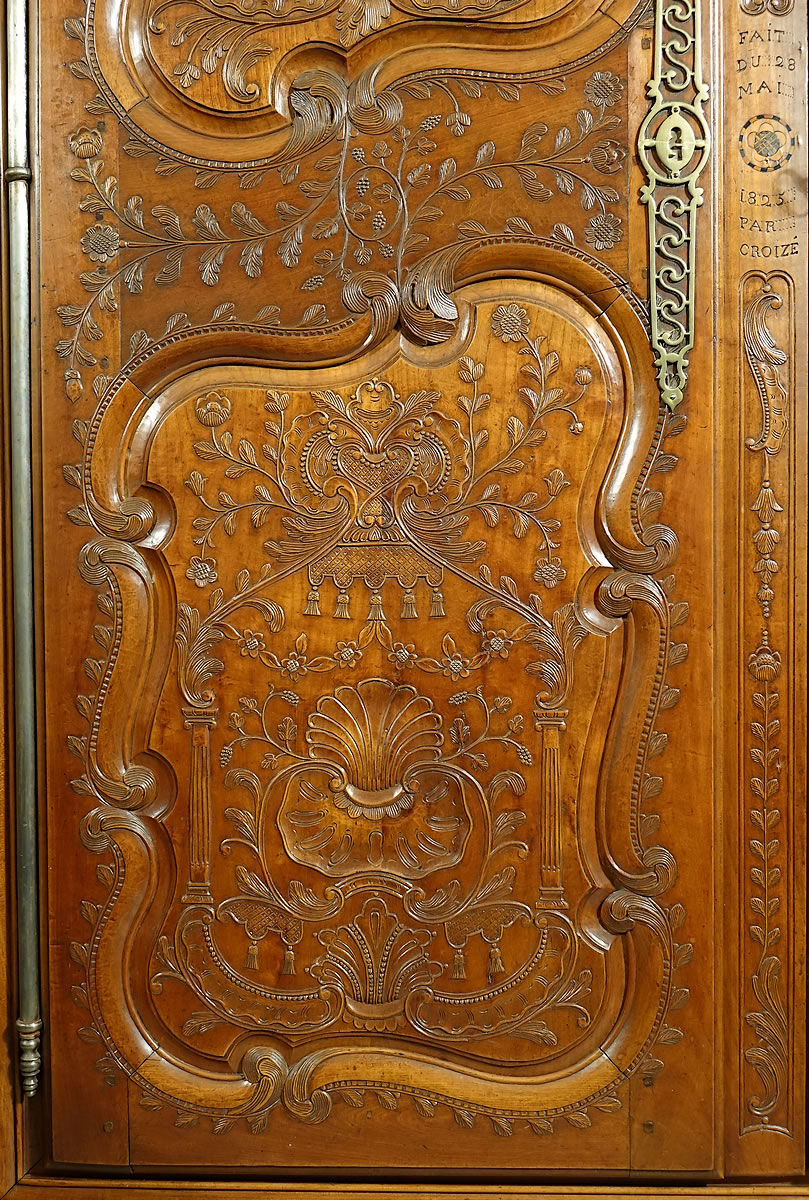 On le voit, la sculpture de Charles II Croizé est d'une finesse sans égale, elle foisonne en une multitude de motifs et la gouge du maitre sculpteur a ciselé les panneaux de merisier avec autant de virtuosité que de grâce et de douceur. Véritablement "de la dentelle". Ce pur chef-d’œuvre du mobilier de Haute Bretagne invite imanquablement au toucher, à la caresse. On observera particulièrement : - La corniche sculptée d'acanthes imbriquées et son formidable fronton "à galerie" ajouré à claire-voie qui s'étire sur toute sa largeur. - La fastueuse ornementation des panneaux animés d'un luxuriant répertoire "à la Bérain" : couronnes, dais, lambrequins ornés de campanes, palmettes, miroirs, "liens d'amour", colonnes ioniques, coquilles au naturel, coquilles allongées en festons, panaches festonnés, rangs de perles, tiges florales, tiges de baies, guirlandes florales, fleurons, acanthes, motifs en C et en S, fonds réticulés... - Le pied dit "en escargot" posé sur bouchon mérite également que l'on s'y arrête, il signe à lui seul un travail de Charles II Croizé car à notre connaissance aucun autre menuisier breton n'a réussi sa découpe et le délié de ses courbes aussi parfaitement.