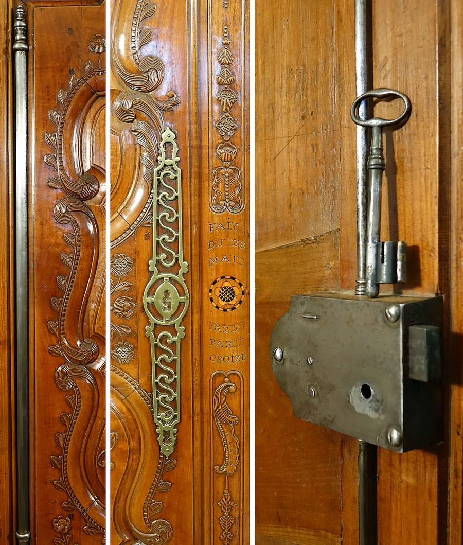 L'armoire possède toujours ses trois étagères d'origine, celle du centre munie de deux tiroirs entièrement fabriqués en merisier tout comme l'est l'intégralité des côtés panneautés. Le dos du meuble d'un beau fini est en poirier massif. Enfin elle est toujours parée de sa serrure à crémone et de sa clé d'origine en fer forgé.