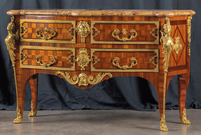 Commode estampillée François Lieutaud où l'on retrouve les mêmes palmettes d'écoinçons, de semblables spires d'acanthe au tablier et allégories de l'Astronomie en côtés. |