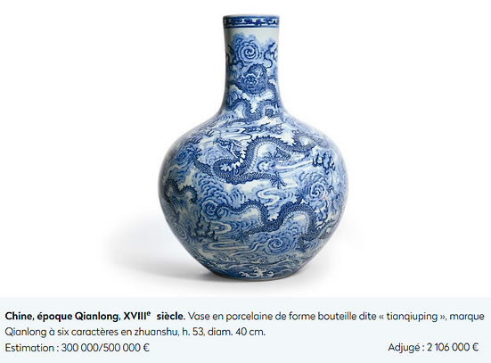 **** Encore faudra t'il bien se garder de l'avis de certains experts, en particulier d'art asiatique, à l'image de Monsieur Vincent L'herrou qui, après avoir estimé dans la fourchette de 800 à 1.000 euros (on voit d'ailleurs cette estimation "doublée" après coup à 2.000 euros, ce qui n'en finit pas d'être amusant) un exceptionnel vase impérial de 54 cm du XVIIIe siècle (aux neuf dragons à cinq griffes) vendu 9,1 millions d'euros. |