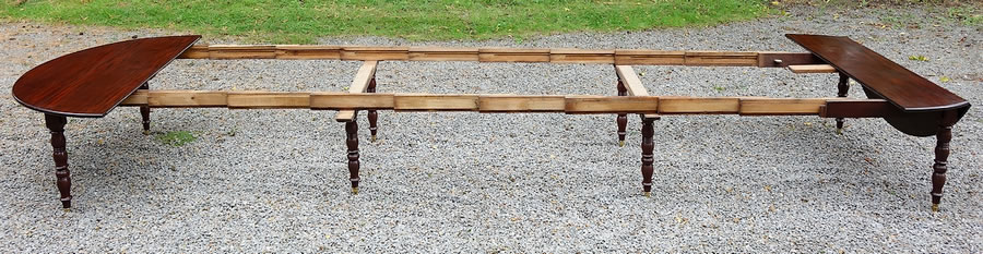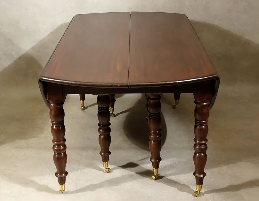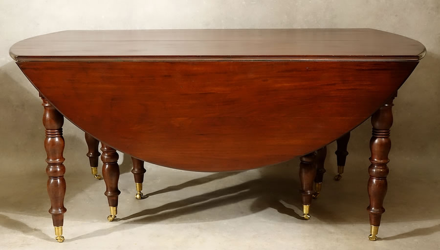Très grande table ronde à huit pieds, à volets et à rallonges, en acajou massif.
