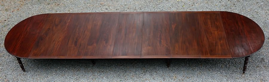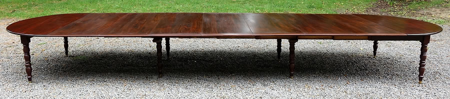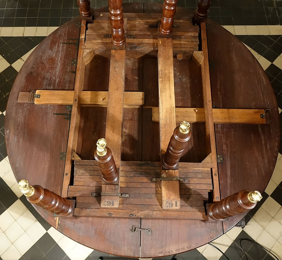 Cette table remarquable de 1,62 m de diamètre peut ainsi se développer jusqu'à atteindre une longueur de 5,80 m sur une largeur appréciable de 1,62 m et, avec une circonférence de 14 mètres, elle peut accueillir à leurs aises 24 convives.