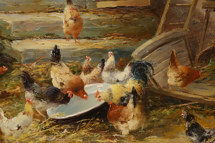comme souvent quand un tableau rencontre le succès du public, le peintre l'a reproduite avec quelques variantes. (voir en documentation un tableau de nos anciennes Peinture très colorée et lumineuse, scène quasi "vivante". Dans son cadre à canaux en bois et stuc doré à la feuille d'or.