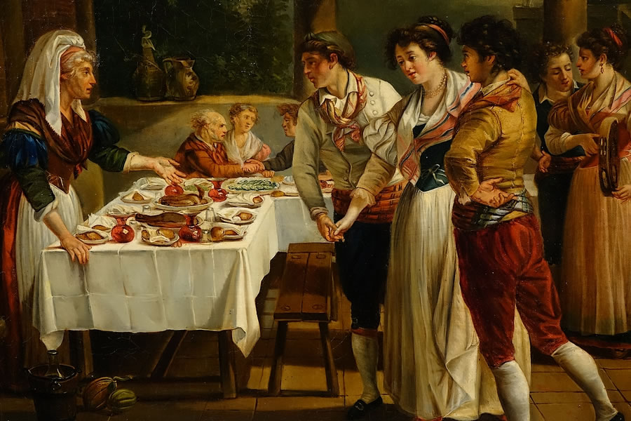 Grande huile sur toile représentant une scène napolitaine sous un patio animé de nombreux personnages, couples et musiciens. Il pourrait s'agir d'une copie ancienne d'une œuvre de Sablet (Jacques Henri Sablet dit « le Peintre du Soleil ». Morges -Suisse- 1749 - Paris 1803) représentant un banquet de fiançailles à Naples (à condition toutefois que l'œuvre très similaire référencée sur Artnet soit bien de la main du peintre et non pas plutôt, comme nous le suspectons, une seconde version de notre tableau). École (très probablement) française du XIXe siècle.