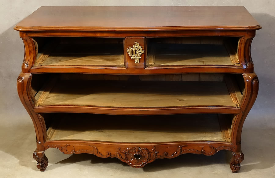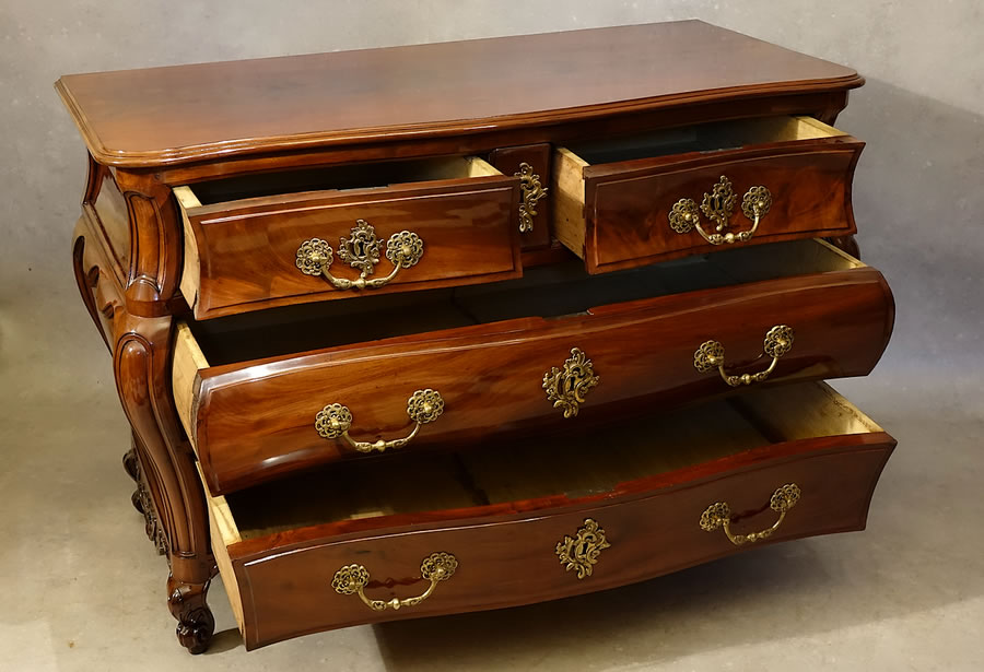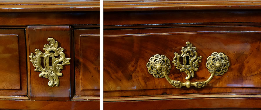 Comme sur les plus beaux modèles bordelais, on observe ici un superbe plateau fait d'une seule planche d'acajou, non chevillé mais jointé par tasseaux en contre-parement avec les traverses latérales, et au pourtour mouluré d'un bec-de-corbin. Pour les garnitures, la commode est parée depuis son origine d'une fort riche ornementation de bronze : belles poignées de tirage à rosaces ajourées et larges entrées de serrure rocailles. Sa facture générale de construction est également de la meilleure des qualités : bordures intérieures des montants et traverses ourlées d'un talon et encadrements des tiroirs décreusés de plate-bandes. Exceptionnel état de conservation, aucune greffe à signaler sur l'ensemble de la commode et aucun dommage tel que griffures, arrachements ou autres...