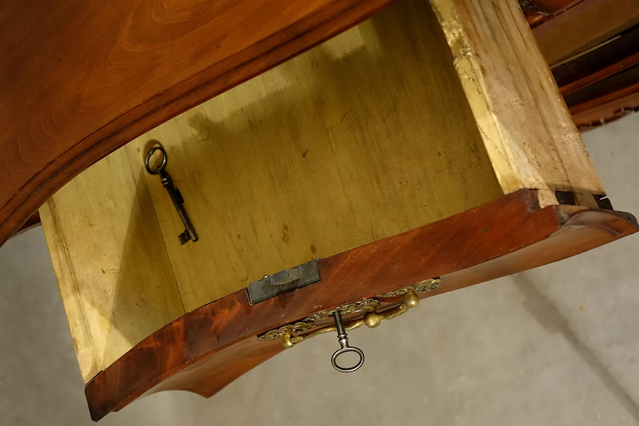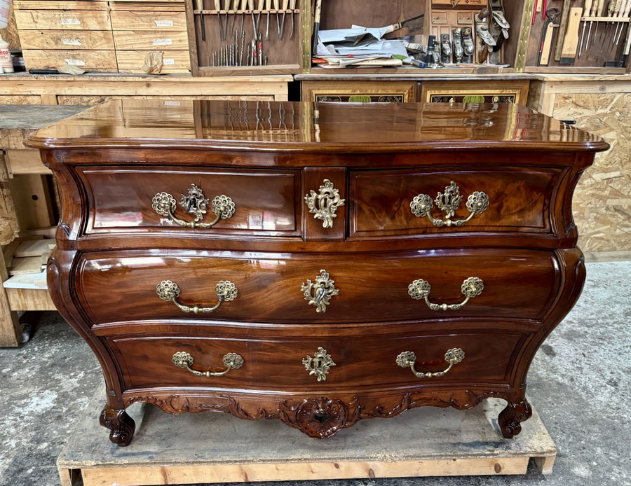 Commode chez notre ébéniste. Photographie en lumière naturelle qui rend mieux compte du veinage ramageux de l'acajou. |