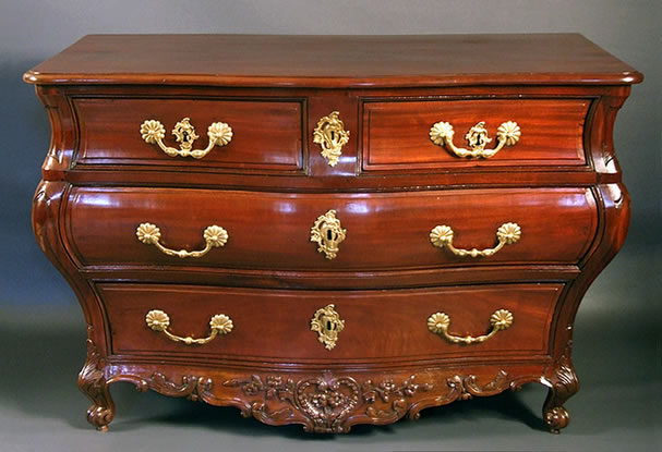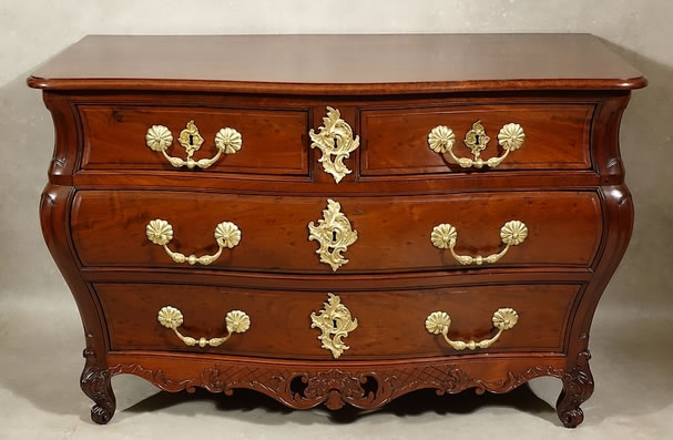 Cette commode de grande qualité s'inscrit dans la période dite "parisienne" du mobilier bordelais : alors qu'au XVIIIe siècle ce port marchand est en pleine prospérité les meilleurs ébénistes de la cité, parfois épaulés par des sculpteurs venus de Provence, ont cherché à égaler les modèles parisiens, en parant de somptueuses sculptures (plus ou moins en fac-similé des bronzes parisiens) leurs très beaux acajous des Antilles ou du Honduras.