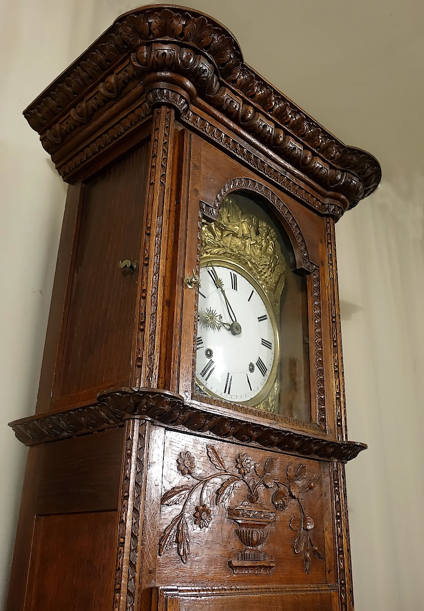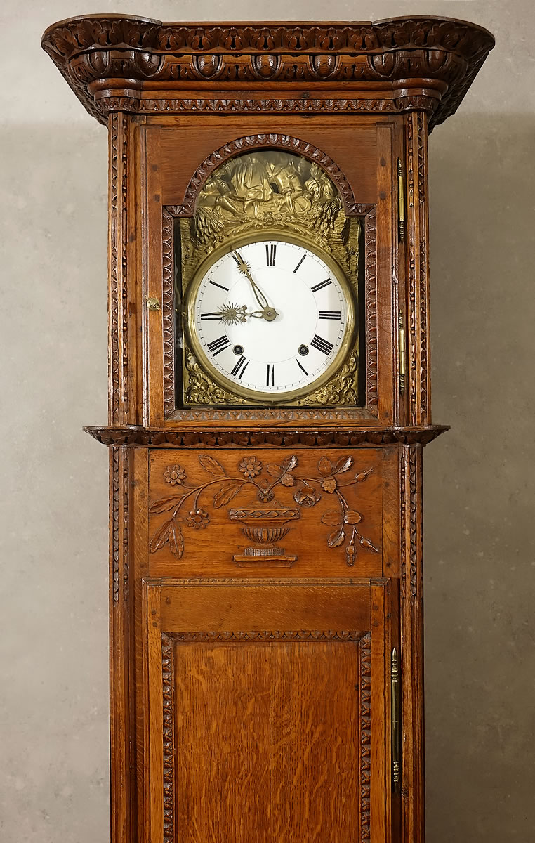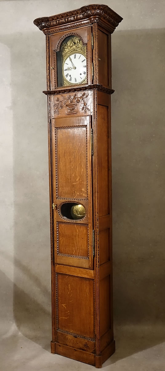 Très rare horloge de la Manche en chêne mouluré et sculpté. Il convient tout de même rappeler l'existence d'une horloge demoiselle viroise en merisier, entrée il y a bien longtemps dans les collections du Musée de Villedieu-les-Poëles ainsi qu'une autre photographiée dans l'ouvrage Le mobilier régional français de Suzanne Tardieu, partie consacrée à la Normandie, mais ces deux modèles, incontestablement virois, ne rappellent pas avec tant d'immédiateté qu'ici les fameuses armoires de Vire. On retrouve en effet une semblable corniche à ressauts, de fines colonnes et un décor sculpté caractéristiques des sculpteurs virois. Par ailleurs, elle est entièrement fabriquée dans un bois de chêne de qualité, avec toutes les parties visibles en chêne merrain. Le mouvement complet et d'origine est un modèle comtois à décor en repoussé d'une scène de danses villageoises. Cette horloge à une histoire, histoire qu'à tenu à nous conter son dernier propriétaire (un peu surpris que nous l'ayons, depuis la Loire Atlantique où nous avons fait sa rencontre, immédiatement attribuée à Vire) : au soir du 6 juin 1944, ses aïeux prirent leurs enfants par la main et la brouette avec dedans notre horloge et des carottes pour le souper du soir... Voilà une belle histoire qui rappelle l'importance de la vénérable horloge dans les campagnes de jadis. Execptionnel état de l'ensemble du meuble, parfaite finition cirée.