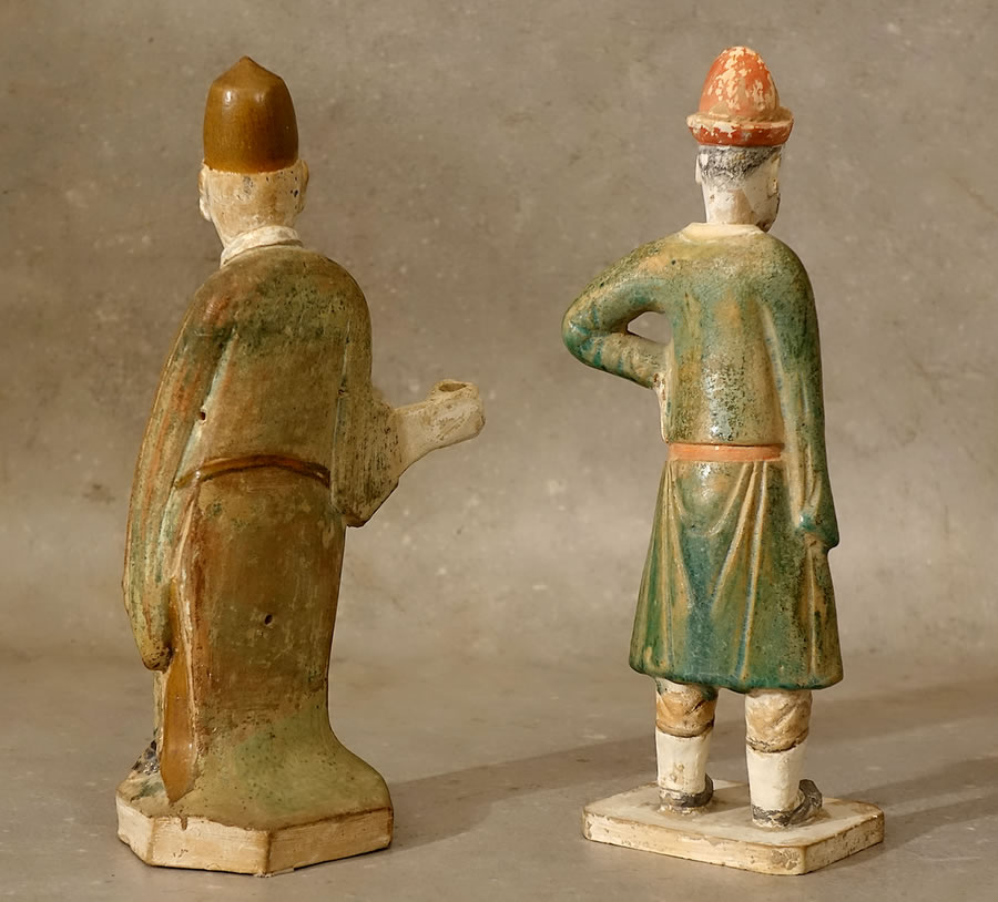 Deux statuettes en terre cuite à glaçure verte formant pendants, dites mingqi (prononcer : min-chi - littéralement : qui brille dans la nuit) représentant des dignitaires (ou serviteurs).