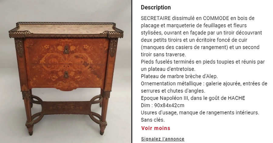 1 - vous achetez donc en salle des ventes une commode bidon et (en l'espace d'une semaine / ce doit être à peu près le temps qu'il faut pour faire faire une belle clé) vous la vendez (ou du moins tentez de la vendre) pour une véritable commode de Hache (c'est relativement facile quand votre support est un site qui ne ne fait pas trop de cas de la déontologie).