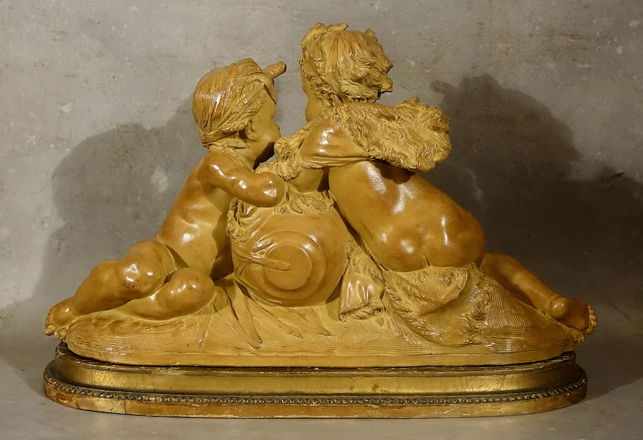 Importante sculpture en terre cuite représentant deux putti accoudés